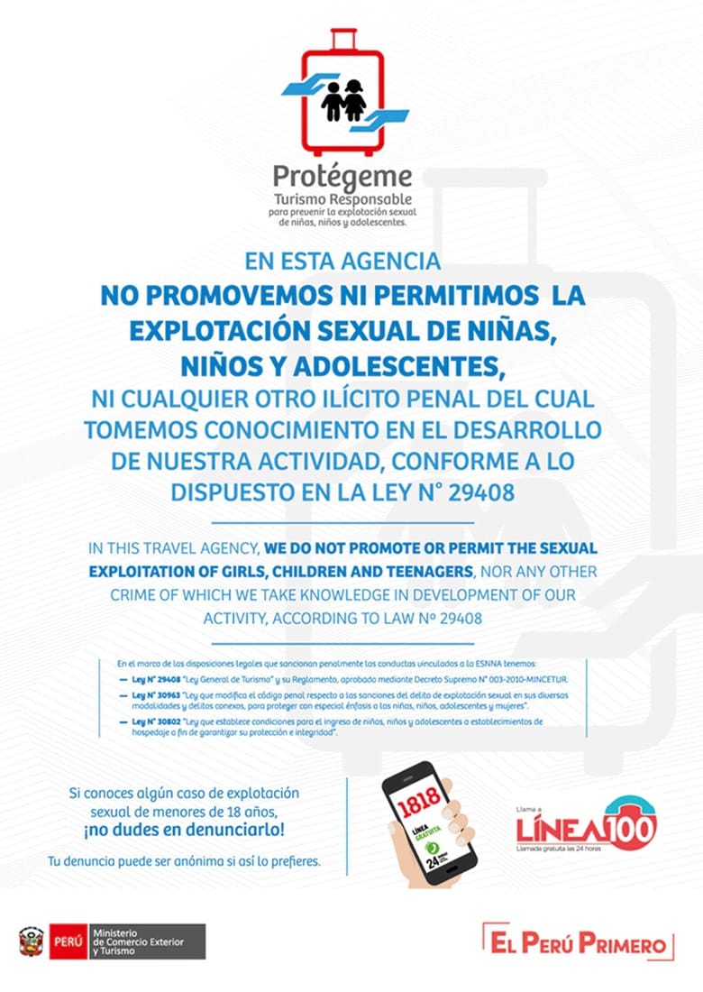 The Ministry of Foreign Trade and Tourism of Peru has expressed its commitment to combating the sexual exploitation of children and adolescents through the implementation of the Code of Conduct against ESNNA. This essential initiative of the Ministry aims to raise awareness and train all stakeholders involved in the Peruvian tourism sector with the purpose of preventing and eliminating the sexual exploitation of minors (under 18 years of age).